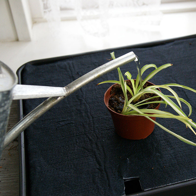 Kapillärmattan läggs tex. med halva delen på diskbänken och resten ner i diskhon som fylls med vatten. En perfekt lösning då vattennivån ska vara lägre än jorden i krukorna. OBS! För att detta ska fungera är det viktigt att hålet i krukan kommer i kontakt med mattan. Läs mer här om underbevattning.