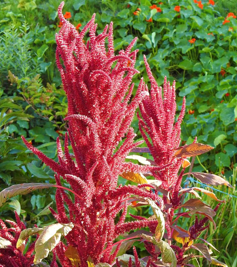 Amarant odlas vanligen i utekruka, men är också pampig i en rabatt, som här med andra varmröda blommor som zinnia och praktsalvia.