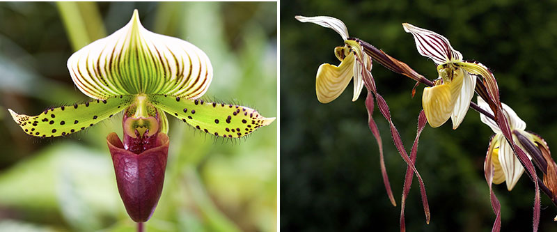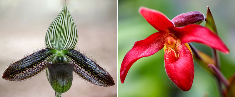 Tv: Venusskor väcker habegär och det är en trevlig orkidésläkt att samla på. Läckra Paphiopedilum wardii härstammar från Burma och sydvästra Kinas skogar. Th: Röda venusskor är ovanliga, slå till om du kommer över en!