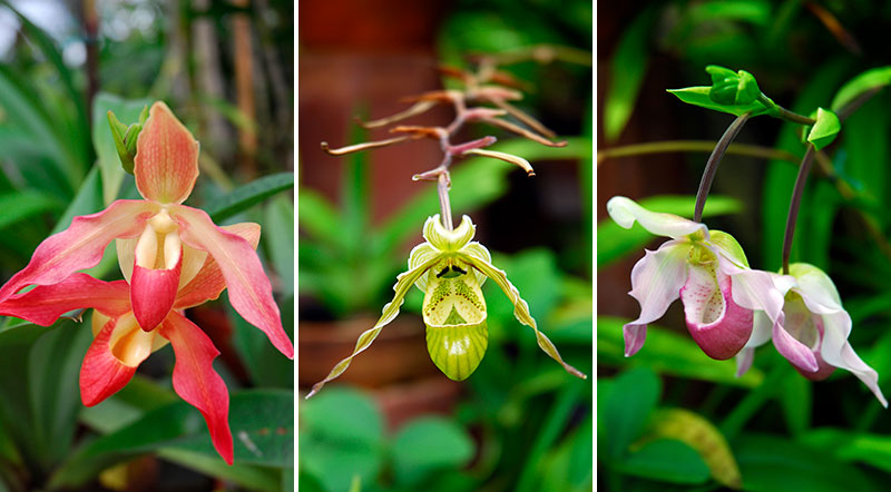 Göteborgs botaniska trädgård har en fin samling venusskor, däribland dessa snyggingar. Längst till vänster en mandarinorkidé, Phragmipedium, en mycket närbesläktad art med samma skötselkrav. Längst till höger den vietnamesiska venusskon, Paphiopedilum delenatii, som får flera blommor på samma stjälk.