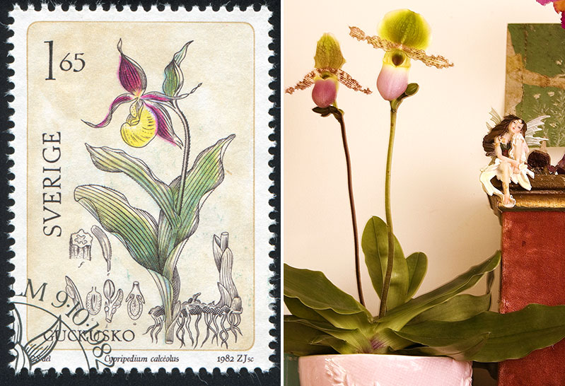 Visst är det något bekant med venusskon? Den är närbesläktad med vår egen vildväxande guckusko, Cypripedium calceolus, som trivs i skogsdungar upp till Norrland. TIll höger: ’Pinocchio’ är den vanligaste hybriden (korsningen) med flera blommor på samma stängel. Petalerna (de utåtstående, smala kronbladen) är charmigt fräkniga med fina hår.