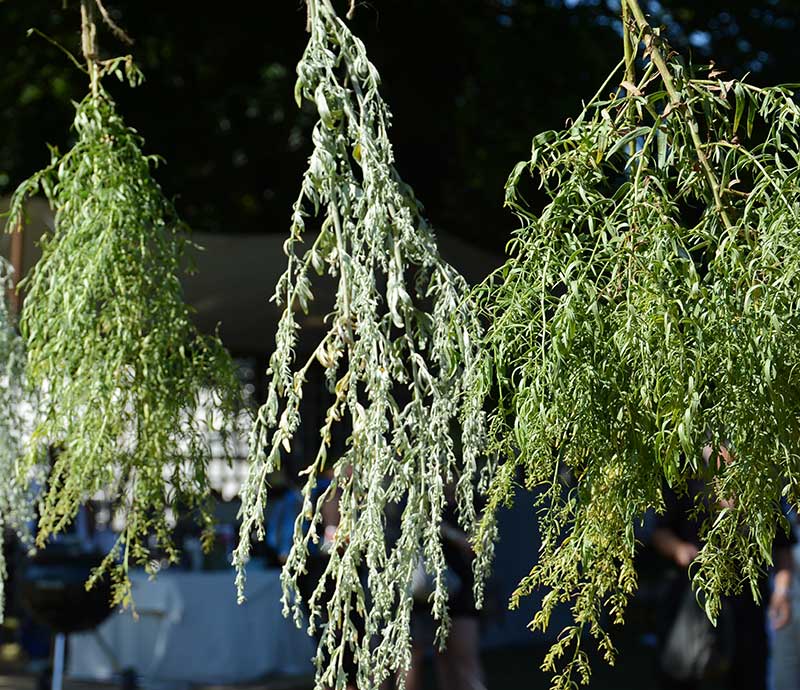 Torkning av dragon längst till höger och närbesläktade malört i mitten. Smaken blir betydligt starkare vid torkning.