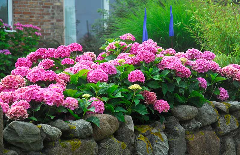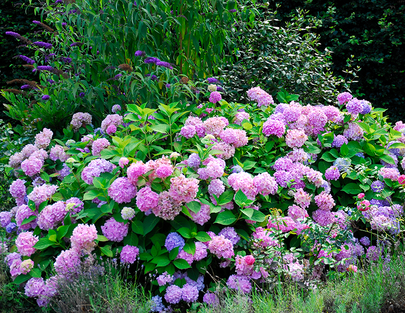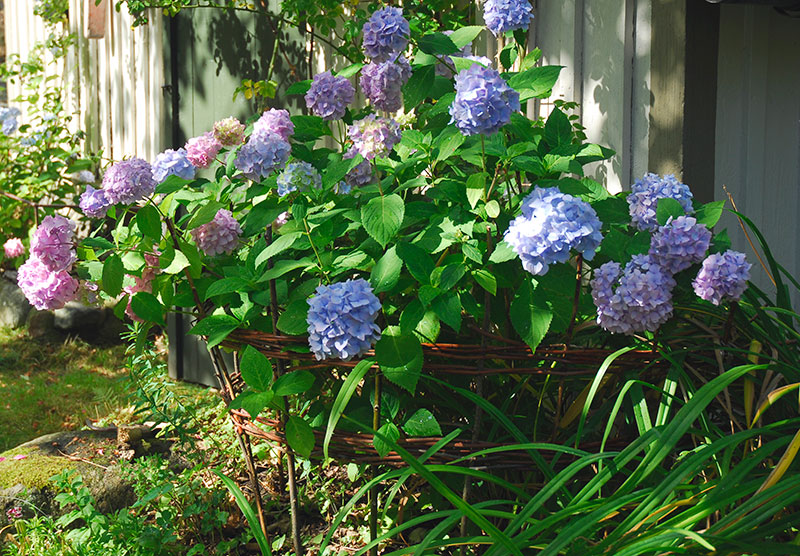 Purpurhortensia som häck vid entré - xPurpurhortensian 'Blue Bird' får rikligt med blommor i vackra skiftningar mot rosa när pH i jorden är lite högre. Härdig till zon 3.