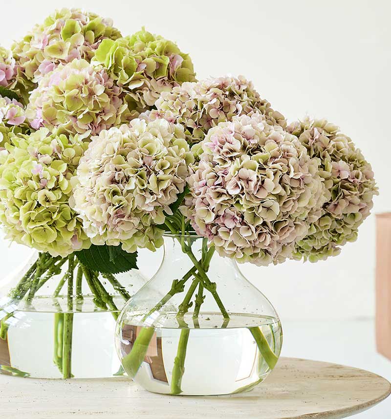 Få blommor är så vackra och hållbara i vas som hortensior. De fyller ut och är lätta att kombinera med till exempel prydnadsgräs. Skär ett långt snitt i stjälken med vass kniv. Tag bort så mycket blad som möjligt, de kan ruttna i vattnet och blommorna står längre utan bladmassa.