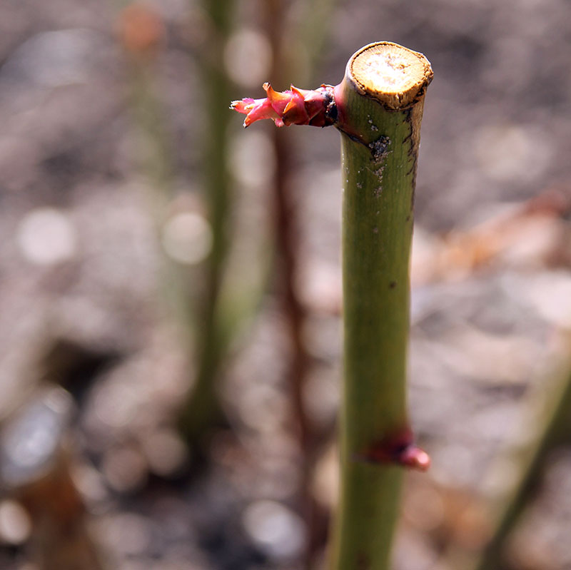 Den nyplanterade rosen beskärs precis ovanför en utåtriktad knopp, eller ett blad. Klipp 10-20 cm ovanför markytan.