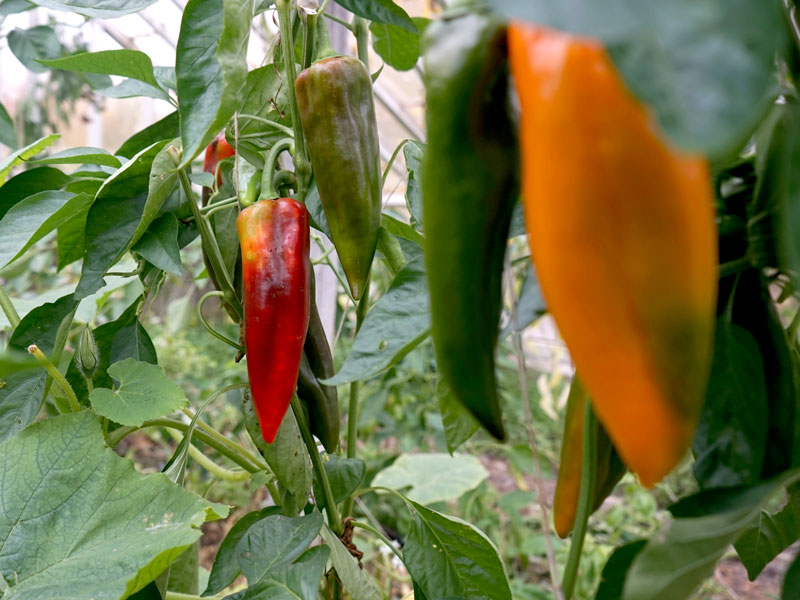 Paprikan 'Spiralus' får avlånga, smala hornlika frukter 22 cm långa.