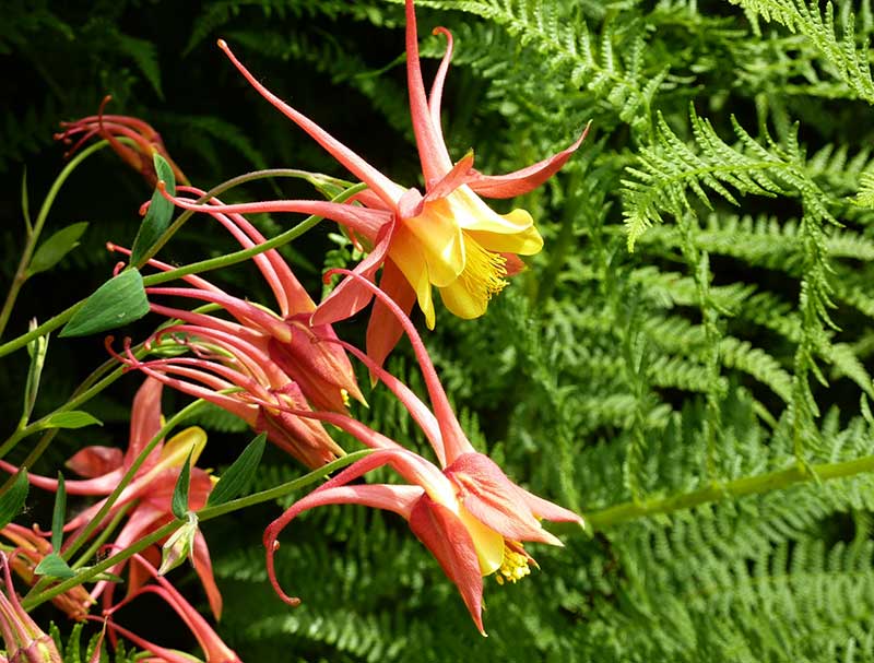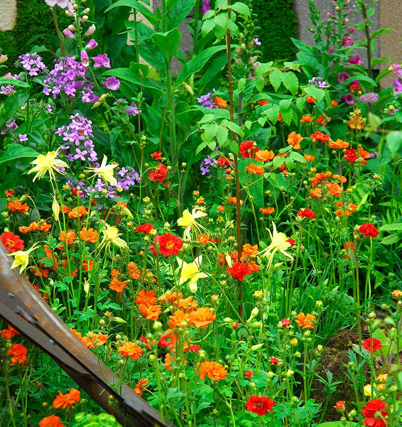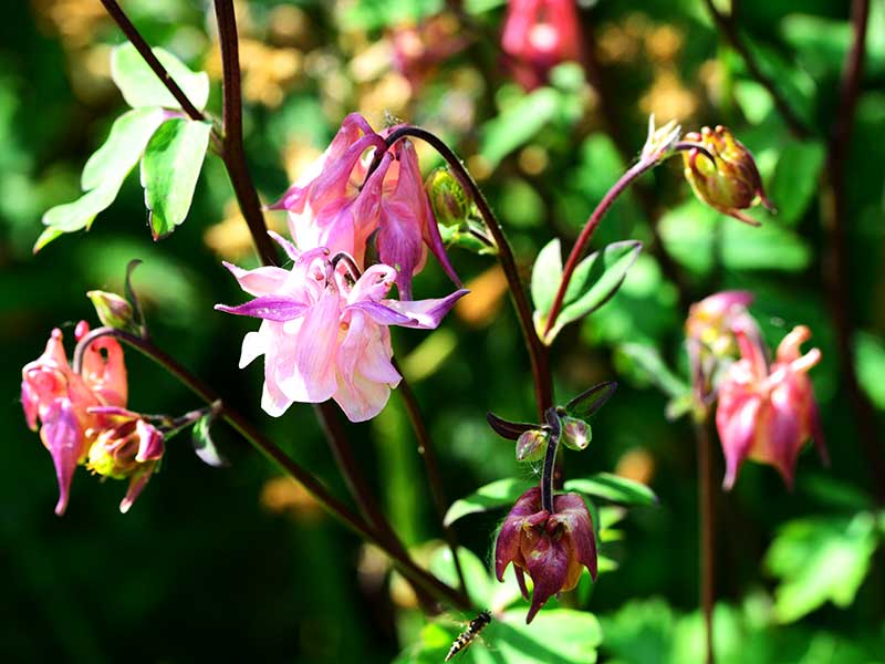 På en halvskuggig plats skimrar aklejor i svala färger som rosa, blått och vitt vackrast, medan rött gult och orange sprakar starkast i solen.