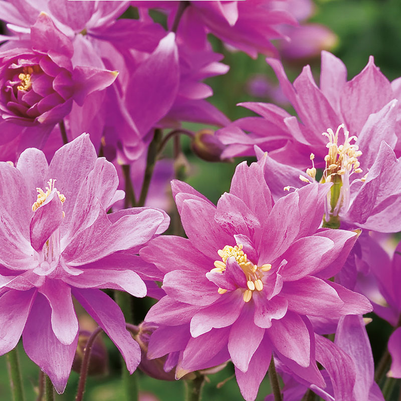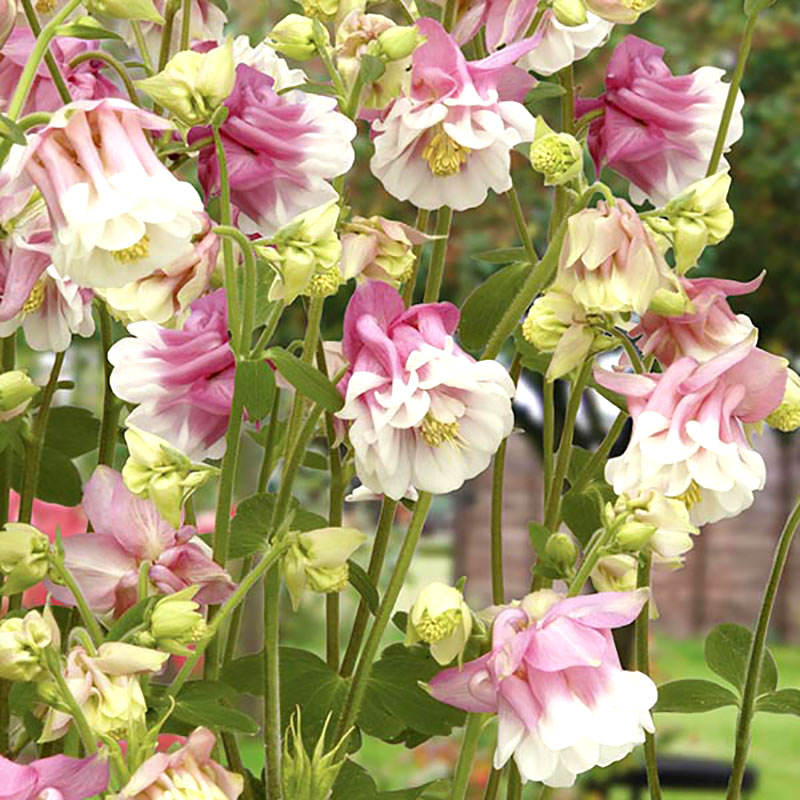 Clementine-aklejorna är dubbelblommande och uppåtriktade. Här akleja 'Clementine Rose'.