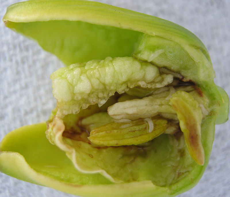 Klipp genast bort angripna knoppar eller blommor så fort du ser dem. Släng i soporna.