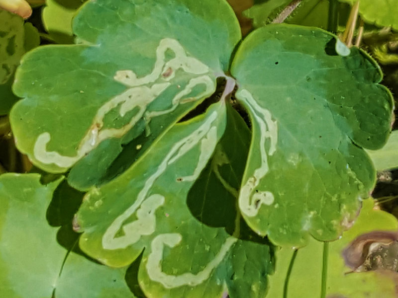 Minerarflugor lägger ägg i bladen. Larverna kläcks inuti och äter av vävnaden. I tomrummet bildas luft som ger ett ljust mönster. Plocka bort angripna blad så fort du ser dem.