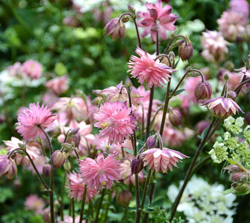 De dubbla sorterna med vågiga kronblad av vanlig akljea ser ut som krinoliner. Här akleja 'Petticoat Pink'.