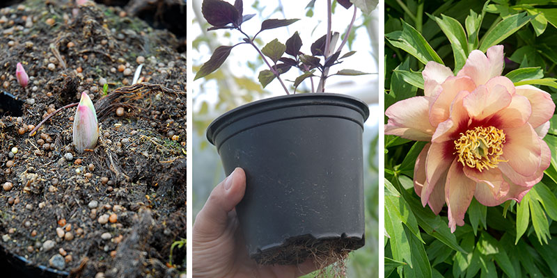 Det är en stor fördel att fördriva barrotade perenner och knölar i kruka. Itoh-pionen ’Callies Memory’ får på några veckor fina rötter och har ett stort försprång jämfört med om den planterats direkt på växtplatsen. Pioner planteras grunt så att tillväxtpunkten kommer precis under markytan.