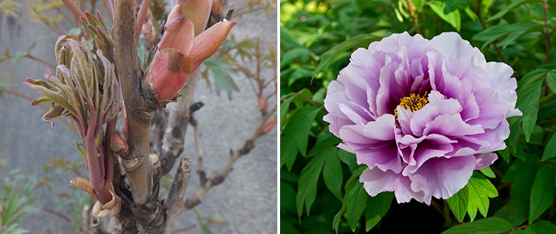 Buskpionen har ett vedartad grenverk som står kvar över vintern. De blir högre än de örtartade pionerna och trivs med lägre perenner kring fötterna. På våren spricker de nya årsskotten fram och är känsliga för sen, svår frost.