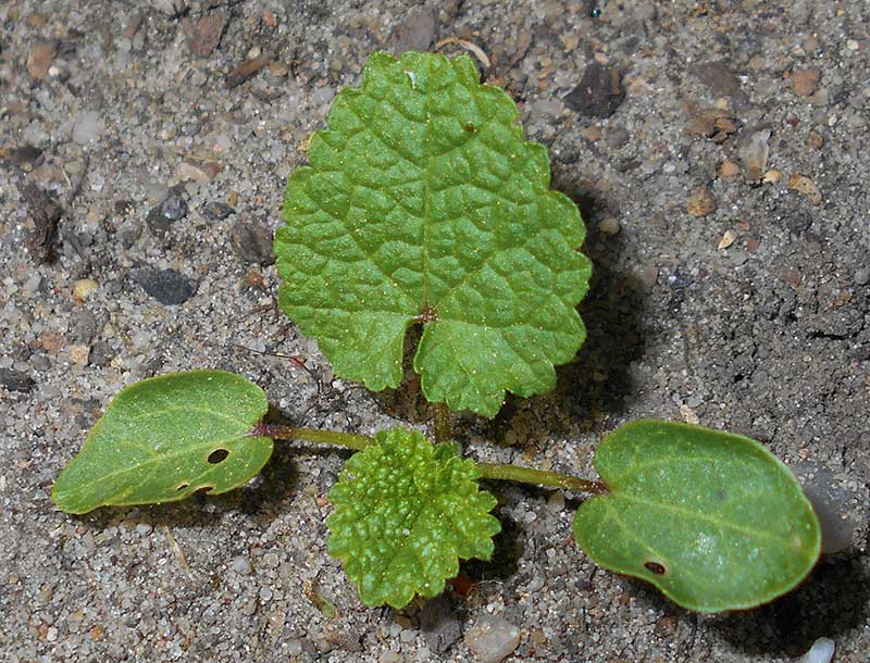 Den lilla groddplantan har redan stockrosens karaktäristiska småbuckliga blad.