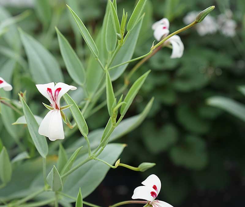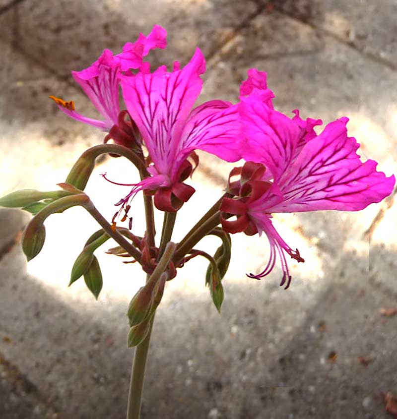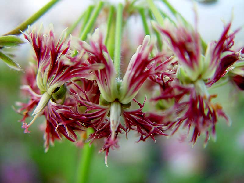 P. caffrum har fransiga blommor i vinrött, vitt och ljusgult