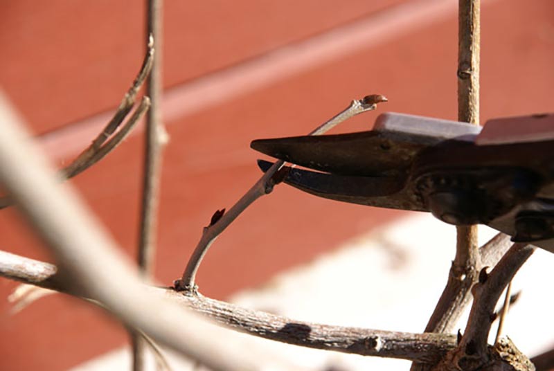 Vinterbeskärningen består i att skära tillbaka fjolårets tillväxt ner till 2-3 knoppar från huvudstammen samt att rensa bort döda och eventuella sjuka grenar.