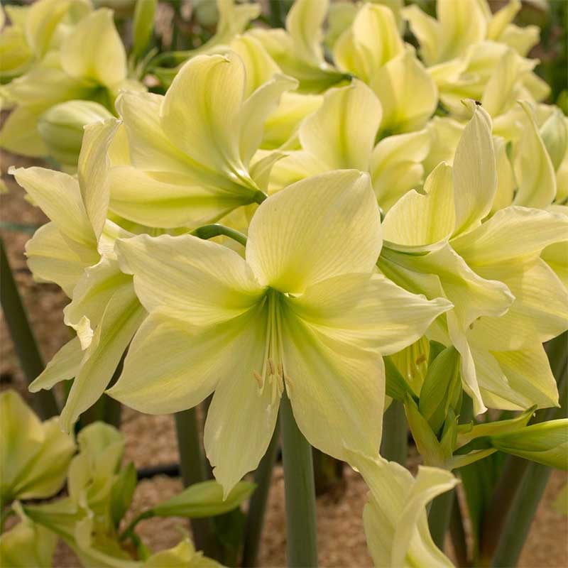 Vacker amaryllis med ovanligt gulgröna kronblad och limefärgat svalg. En storblommig sort som lyser som månsken i vinternatten. Blir ca 50 cm hög.
