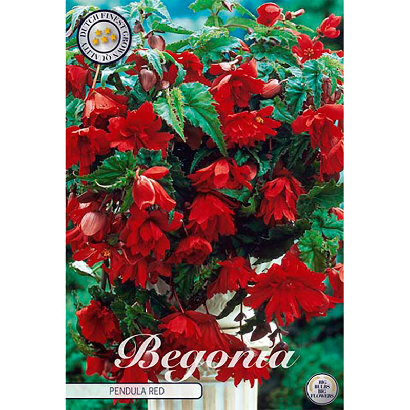 Höjd: 30 cm Färg: rod Typ: hängbegonia Blomningstid: juni-oktober Läge: halvskugga Planteringstid: mars-juli Vetenskapligt namn: Begonia x tuberhybrida 'Red' Antal per förpackning: 3 Storlek lök/knöl: 5/6