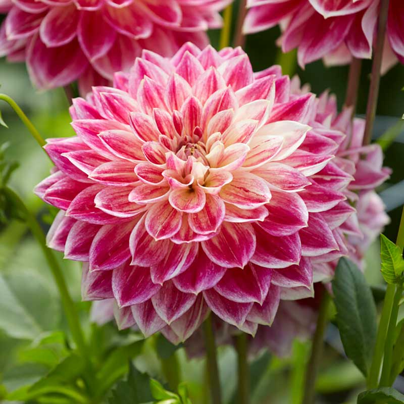 Dahlia ’Temple of Beauty’ är en ståtlig dekorativdahlia med stora, fyllda blommor i mjuka, romantiska nyanser av rosa och aprikos. Rikblommande och pålitlig, perfekt för både rabatt och snittblommor. Blommar från sensommar till höst och blir ca 100–120 cm hög.