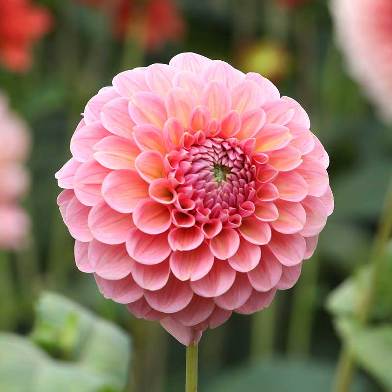 Läckra rosa bollar på stadiga stjälkar som tycks sväva över ett frodigt bladverk. Pompondahliorna har en lång hållbarhet och vecklar sakta ut sin sfäriska bollform.