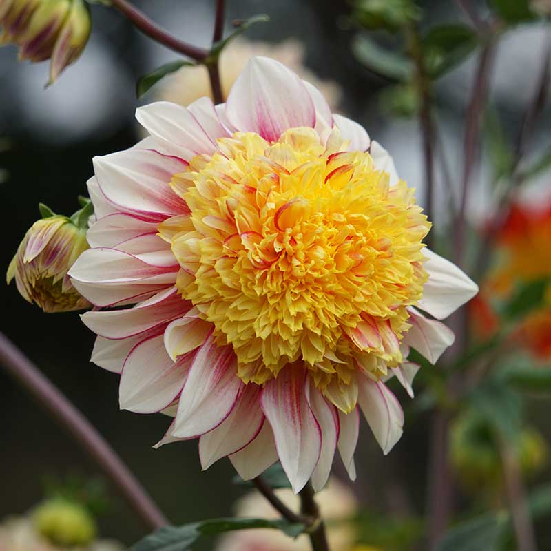 En fantastiskt söt dahlia med anemondahliornas typiskt fyllda blommor i mitten med en krans av enkla kronblad.