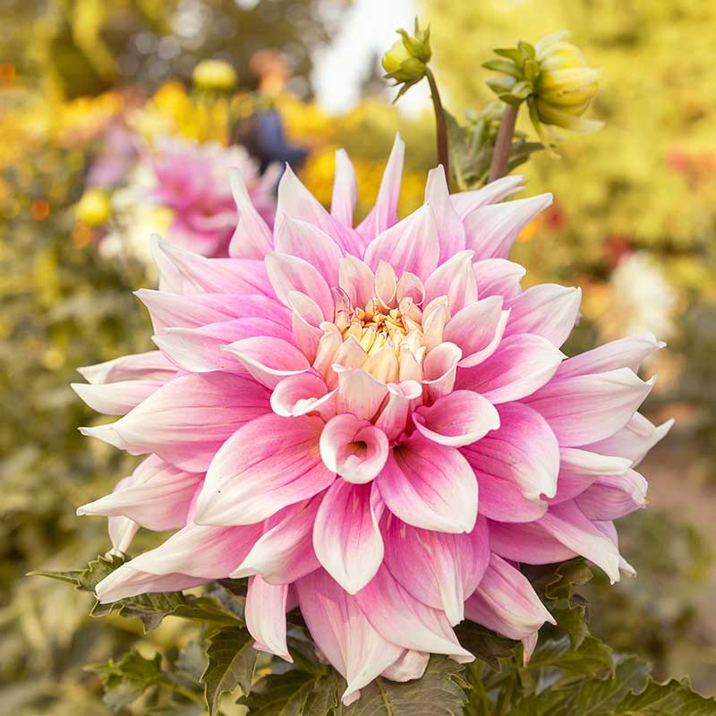 En riktigt läcker tallriksdahlia med blommor som blir över 20 cm i diameter.