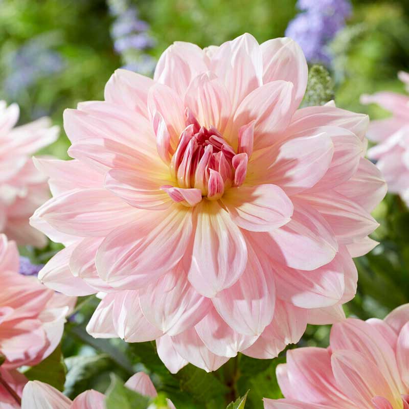 En vacker dahlia med tallriks stora blommor i ljusrosa toner.