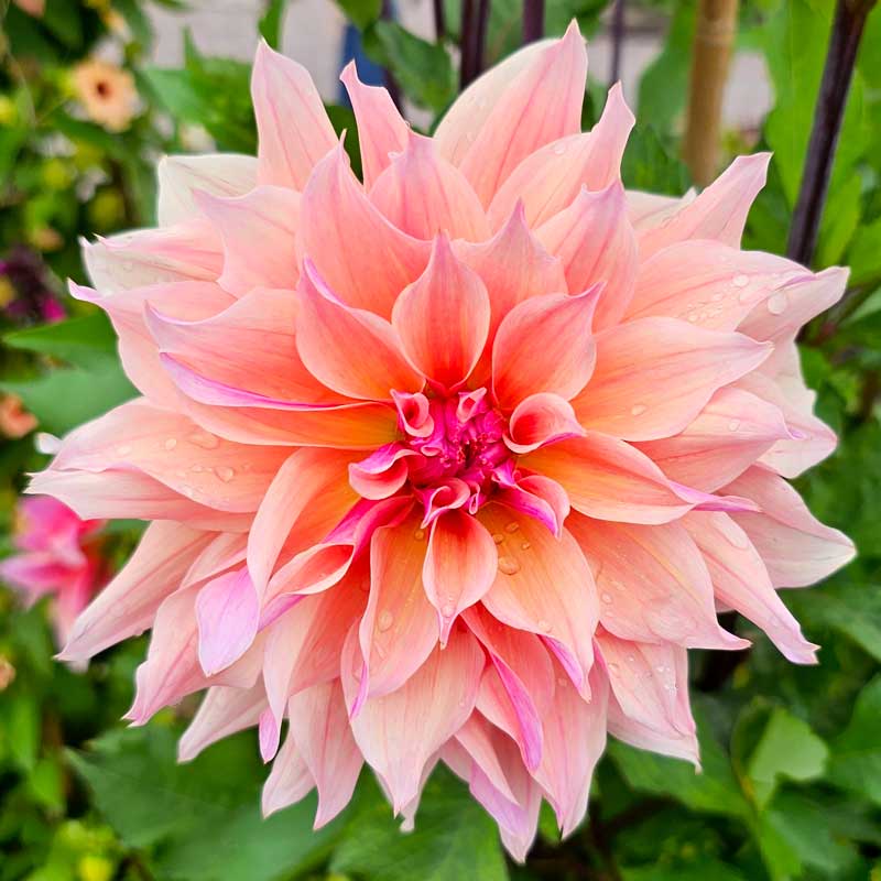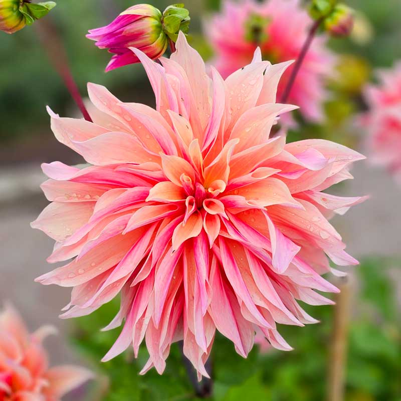 Med närmast teatraliska blommor imponerar denna dahlia med sina upp till 18 cm i diameter stora, fyllda blommor.