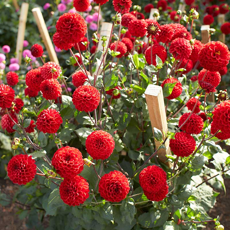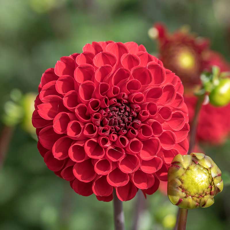 En dahlia med mörkröda blommor av pompontyp.Pryder både rabatt och kruka. Mycket fin som snittblomma.
