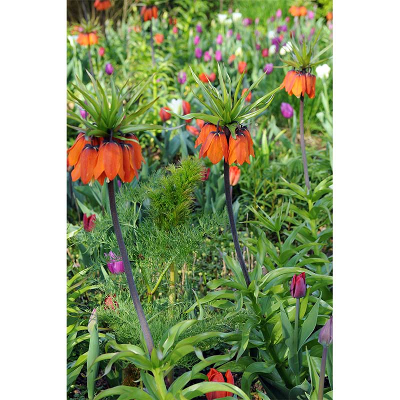Som namnet antyder, kungen i rabatten där den reser sig över alla andra. Denna ovanliga orange sort är riktigt tjusig mot den friska bladgrönskan. Något mer lågväxande och tidigblommande än andra kejsarkronor.