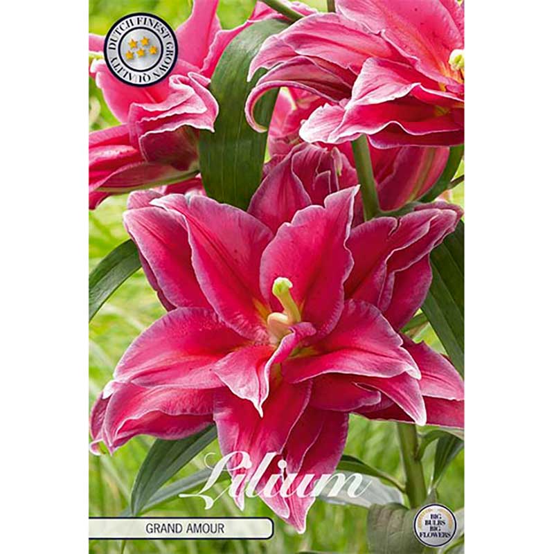 Lilja 'Grand Amour' är en elegant och romantisk orientaliskt lilja med dubbla blommor i en djup rosaröd nyans. Varje blomma har en subtil vit kant och ett gult hjärta som lyser upp när blomman slår ut.