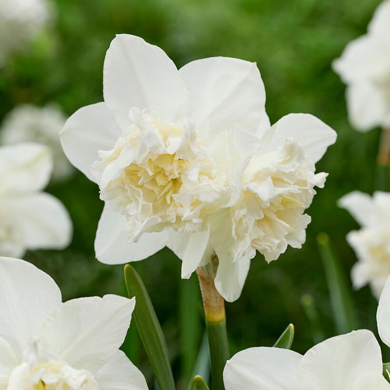 En vit fylldblommig narciss. Vacker i rabatt och som snitt.