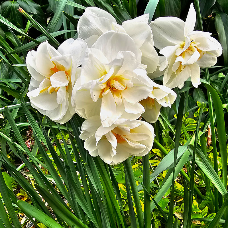 En förtjusande, dubbel narciss i gräddvitt med en rödorange botten. Oemotståndlig i buketter! Stjärnnarcisserna är naturliga hybrider (korsningar) mellan påskliljor och pingstliljor, ursprungligen från södra Frankrike. Narcisser trivs i lite fuktig men väldränerad jord. Rådjurssäker, väldoftande.
