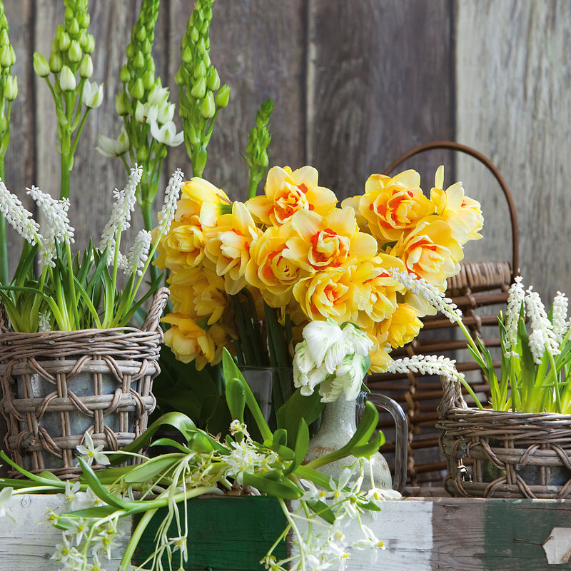 En otroligt omtyckt sort som prisades med AGM* redan när den kom 1956. Dubbla blommor med inslag av orange. Används mycket av florister och är en underbar vasblomma. Stjärnnarcisserna är naturliga hybrider (korsningar) mellan påskliljor och pingstliljor, ursprungligen från södra Frankrike. Narcisser trivs i lite fuktig men väldränerad jord. Rådjurssäker, väldoftande.