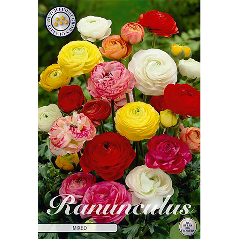 En härlig färgkaskad av fyllda ranunkler, underbara i både kruka, rabatt och buketter. I varma lägen kan de övervintra nedgrävda i genomsläpplig jord. Ranunklerna har ett elegant färgspel som skiftar efterhand som blomman slår ut. Trivs i mullrik, genomsläpplig jord. De små knölarna övervintras som dahliaknölar.