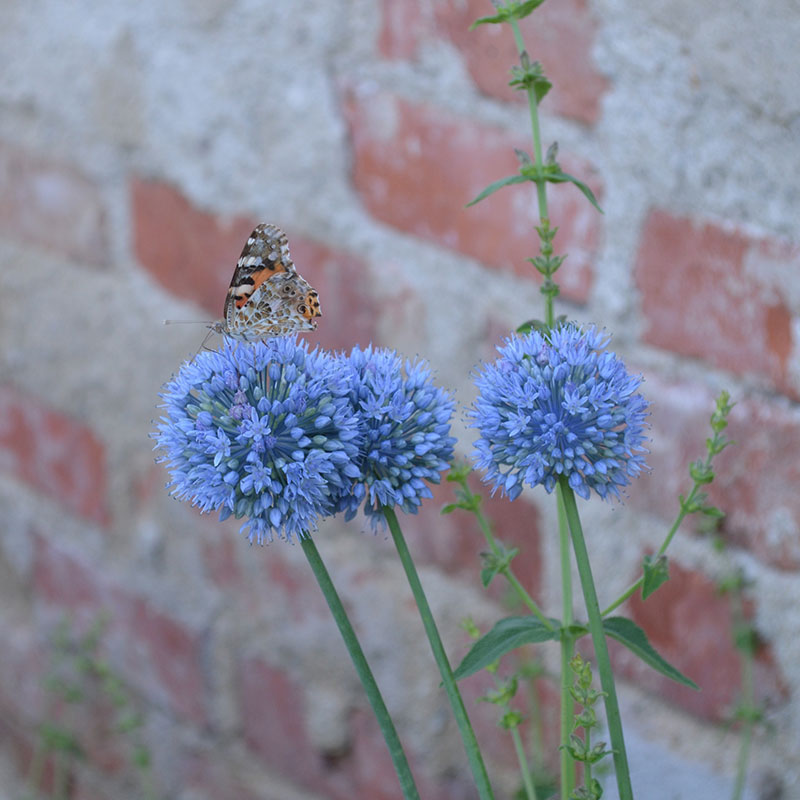 Himmelsblå, sfäriska blommor på stadiga, raka stjälkar är en skön syn som vara i flera månader. Därefter pryder fröställningarna. Den klarblå färgen skiljer azurlöken från övriga bollökar som drar mera åt lila. Återkommer år och kan sprida sig med frön där den trivs i mullrik, väldränerad jord.