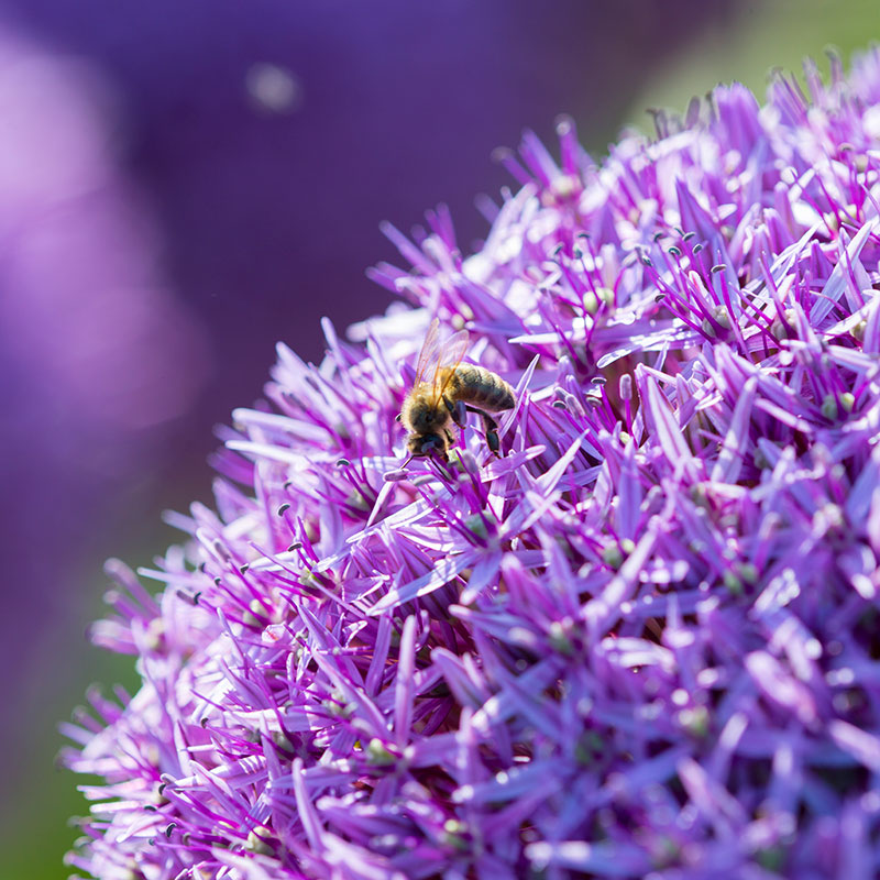 En storblommande allium, kallas även jättelök. Får lila blombollar som kan bli 20 cm i diameter. Står på kraftiga stjälkar. Efter blomningen pryder fröställningarna. Återkommer år och kan sprida sig med frön där den trivs i mullrik, väldränerad jord.