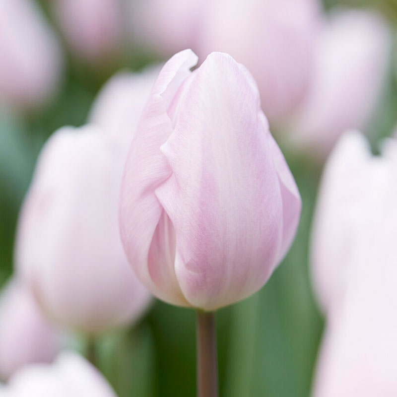 En medeltidig tulpan i en ovanlig ljust rosa-lila-vit färg. Vacker i rabatt och mycket fin i buketten.