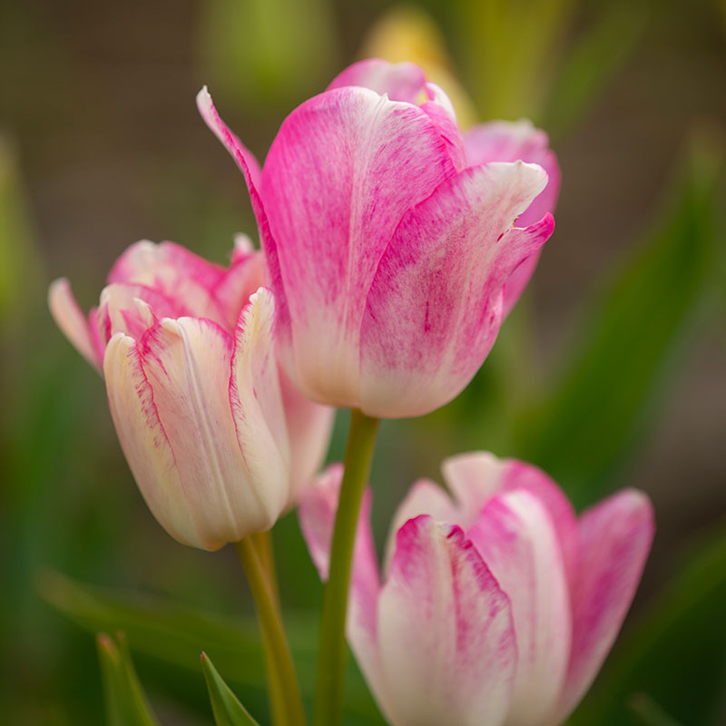 En härlig tulpan som får flera blommor på varje stjälk, som en hel bukett. Skiftar i färg från vitt till rosa.