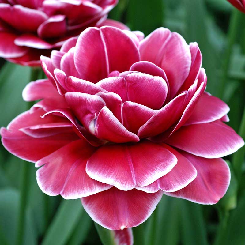 En läcker, maffig tulpan med vit, elegant bård. Skimrar som vackrast i silande ljus. Tillhör de dubbla, sena sorterna som står länge både i rabatt och i vasen.