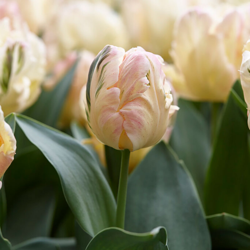 Tulpan 'Libretto Parrot' har rosagröna blommor med vita inslag.