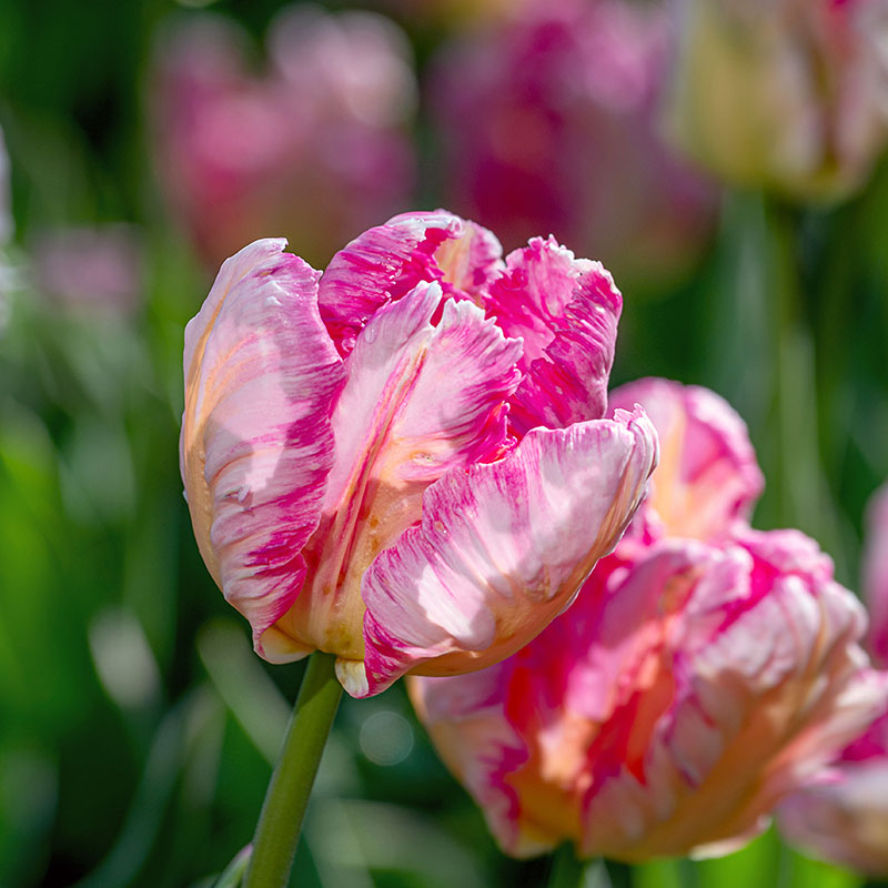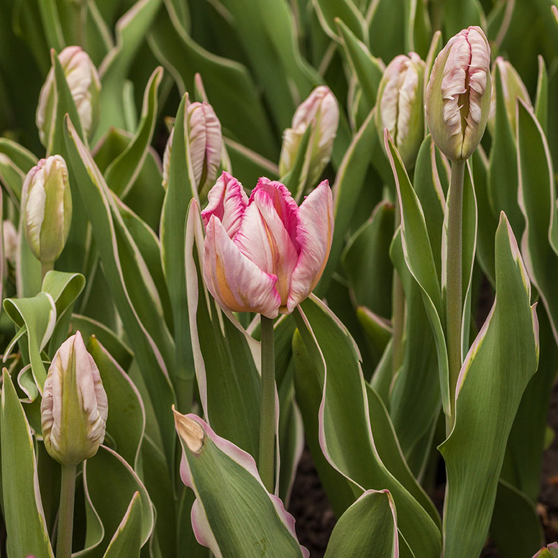 En ljusrosa tulpan men mörkrosa inslag och vita/silveraktiga fält. Papegojtulpaner är häftiga att följa i alla stadier, de genomgår en metamorfos från knopp till fullt utslagen, krumbuktande blomma.