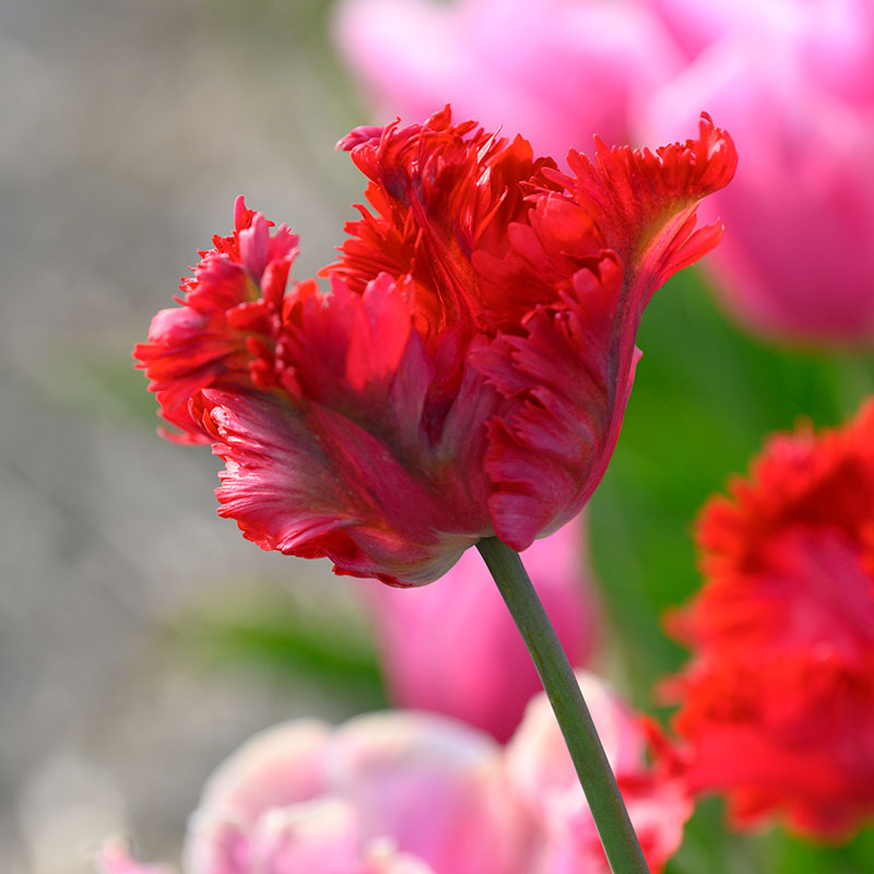 Ett passande namn till denna sprakande tulpan med fransig bård. Papegojtulpaner är härliga att följa i alla stadier, de genomgår en metamorfos från knopp till fullt utslagen, krumbuktande blomma. Föreställningen varar i flera veckor (också i vasen) och de är också långlivade i rabatten. Planteras skyddat för hårda vindar.