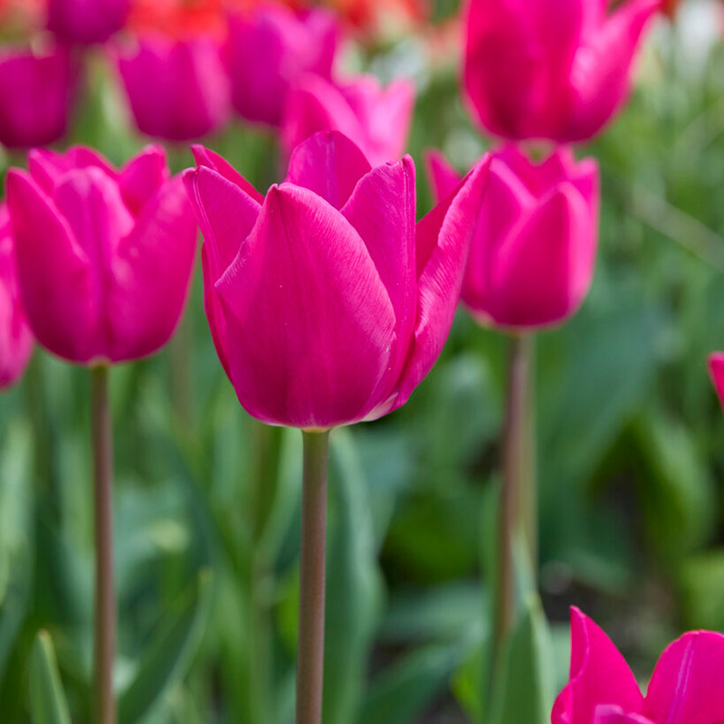 Tulpanen 'Pink Ardour' bjuder på körsbärsrosa blommor med inslag av violett, och i solljus kan ännu fler nyanser komma fram. Blommorna är stora, enkla och hållbara, bärs upp av kraftiga stjälkar och blir omkring 45 cm höga.