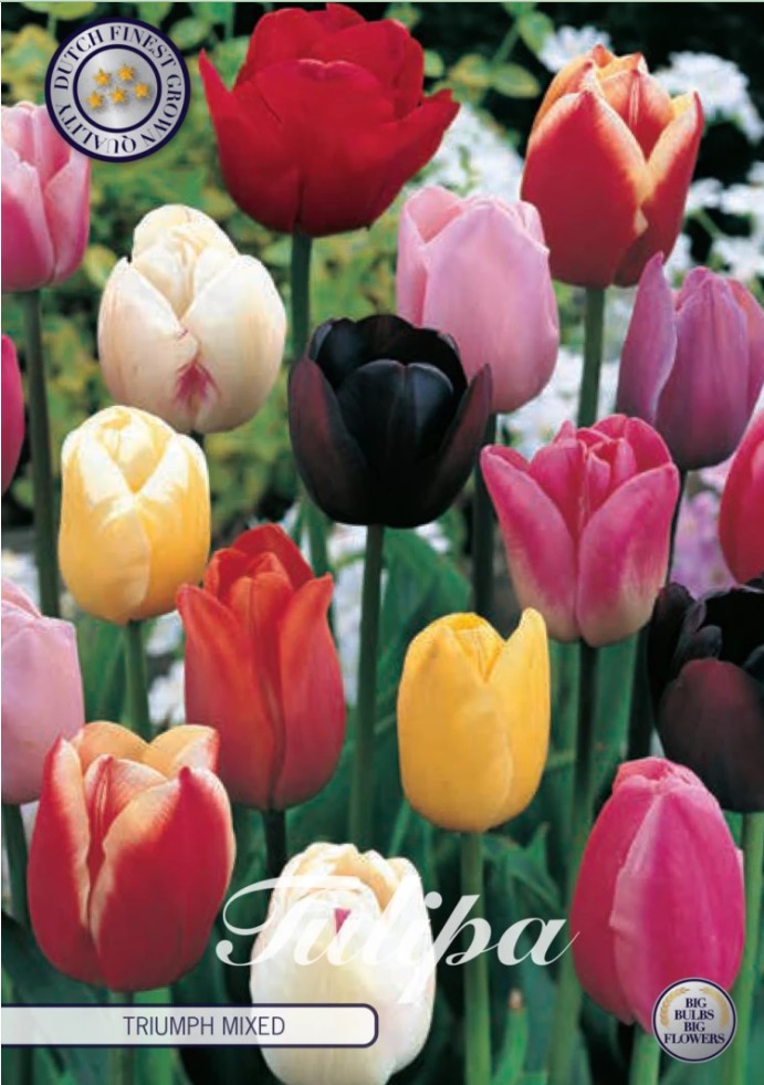 En underbar mix av olika triumphtulpaner. Något får dig som vill ha en riktigt färgbomb i rabatten när våren slår ut. De starka stjälkarna tål även ett mer utsatt läge.