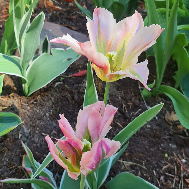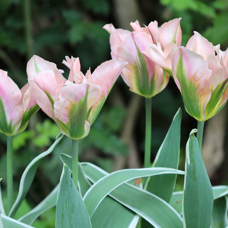 'China Town' har ett ovanligt färgspel med mjukt rosaskiftande kronblad och gröna foderblad. Till detta kommer de grågröna bladen som har viridiflora-tulpanernas karktäristiskt vita rand.