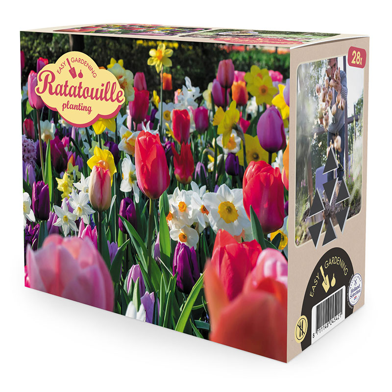 En generös blomsterlökblandning i rengbågens färger. En härlig färgklick i rabatt och i kruka på balkong eller terrass.