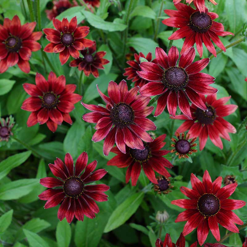 En sommarrudbeckia med härliga cherryröda stora blommor, stadiga stjälkar och fint förgrenat växtsätt. Passar i stora krukor på balkong och altan. Snygg som snitt!