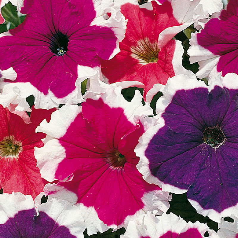 Ingen missar denna häftiga kombination av starka färger omgivna av en vit bård. Petunia är lättodlade sommarblommor som ger en lång, rik blomning för liten odlingsmöda. Passar i utekruka, blomlåda eller i ampel.
