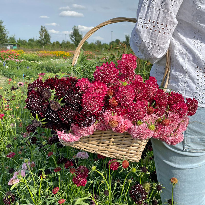 Praktvädd är en ljuv sommarblomma som passar i de flesta stilar. Denna får stora, tätt dubbla blommor i en varm klarröd ton som älskas av pollinerande insekter. Lättodlad med lång blomningstid. Höga stjälkar, fin till snitt.